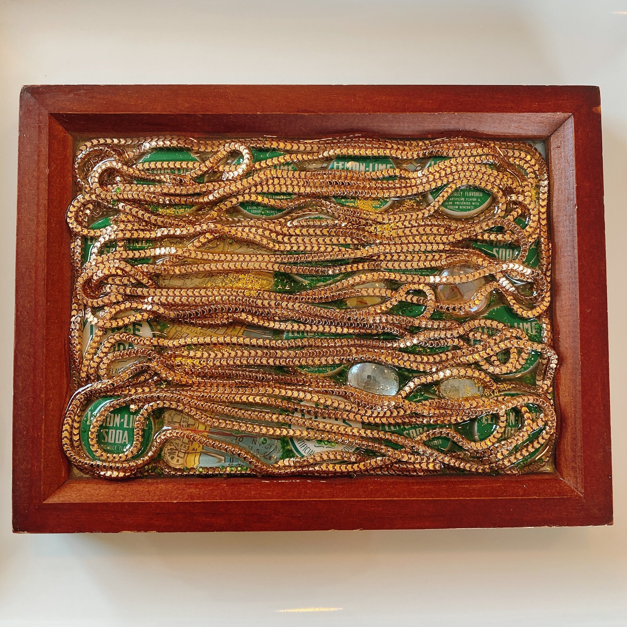 ベースにマンハッタン、ブルックリンの地図を敷き、そこからヴィンテージ王冠やシードビーズ、ラメを散らしながら樹脂の層を形成してゆきます。