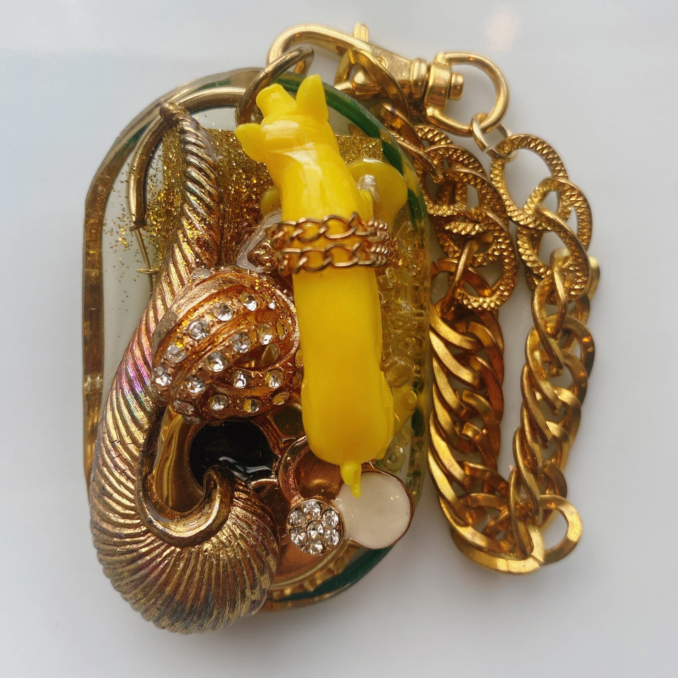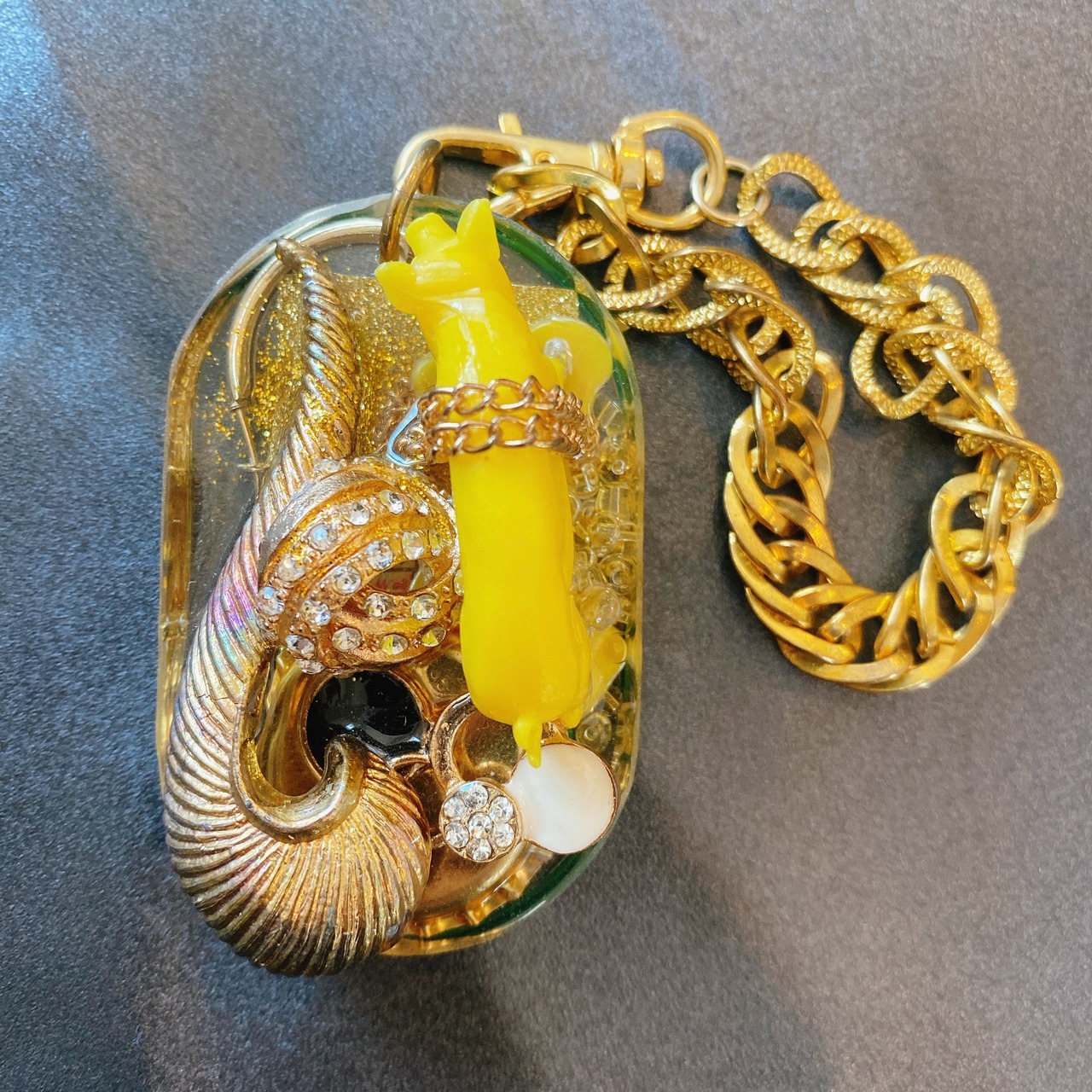 様々なジュエルパーツ、アクリルボールやシードビーズ、ユニークなモチーフたち、デザインによっては鍵(レプリカではない、実際にアメリカで活躍していた鍵です)をコラージュしながら重ね固めております。