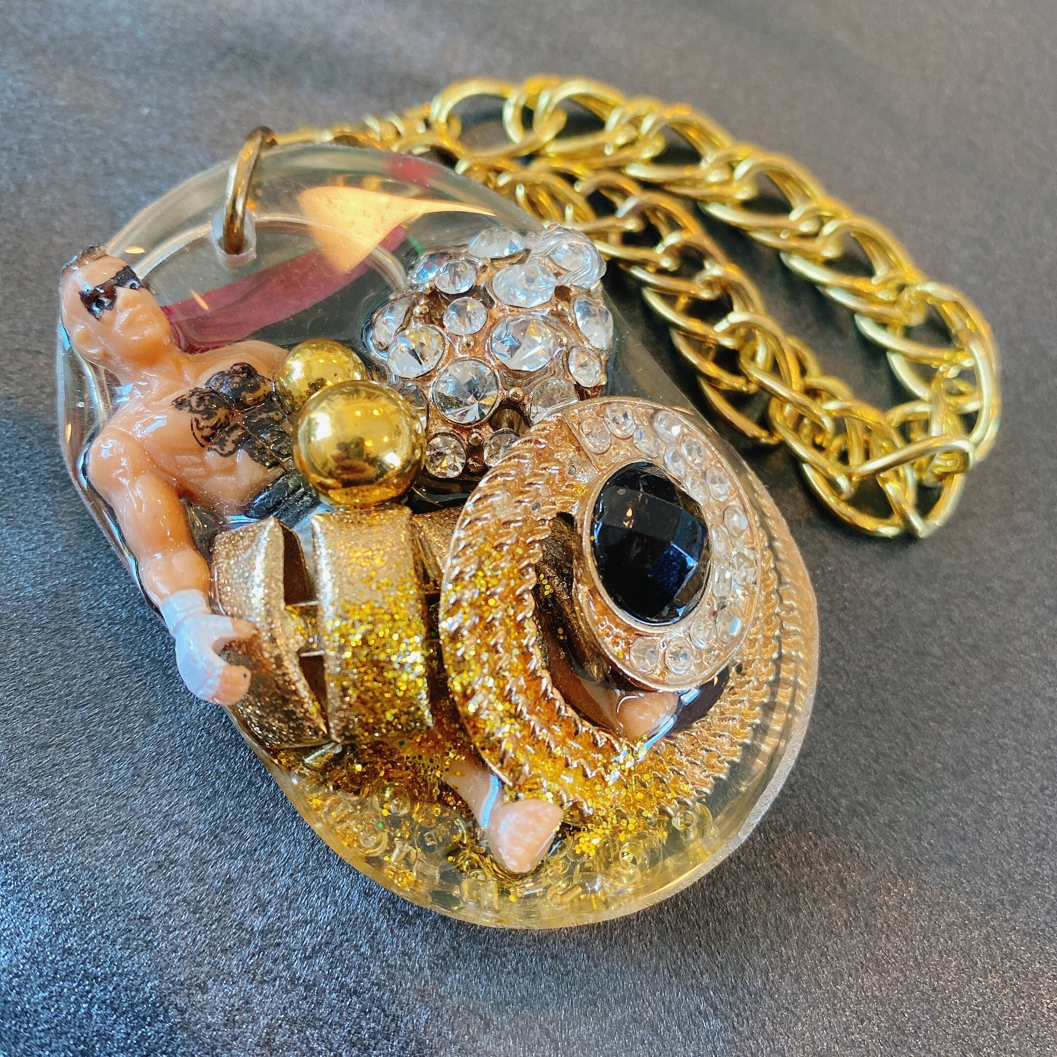 チャンピオンベルトに見立てたゴールドの幅広特注チェーンが印象的。