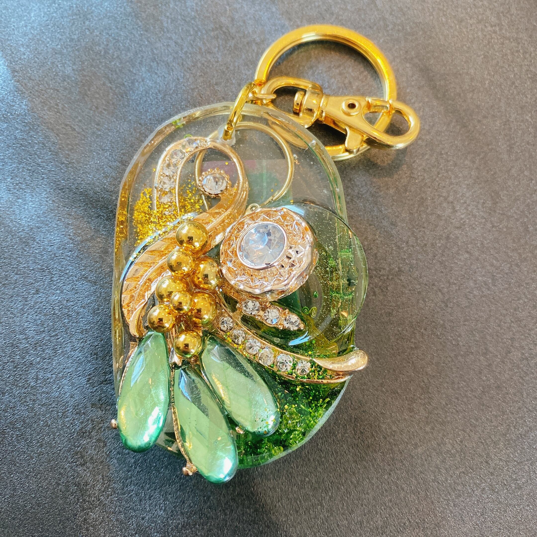 様々なジュエルパーツ、アクリルボールやシードビーズ、ユニークなモチーフたち、デザインによっては鍵(レプリカではない、実際にアメリカで活躍していた鍵です)をコラージュしながら重ね固めております。