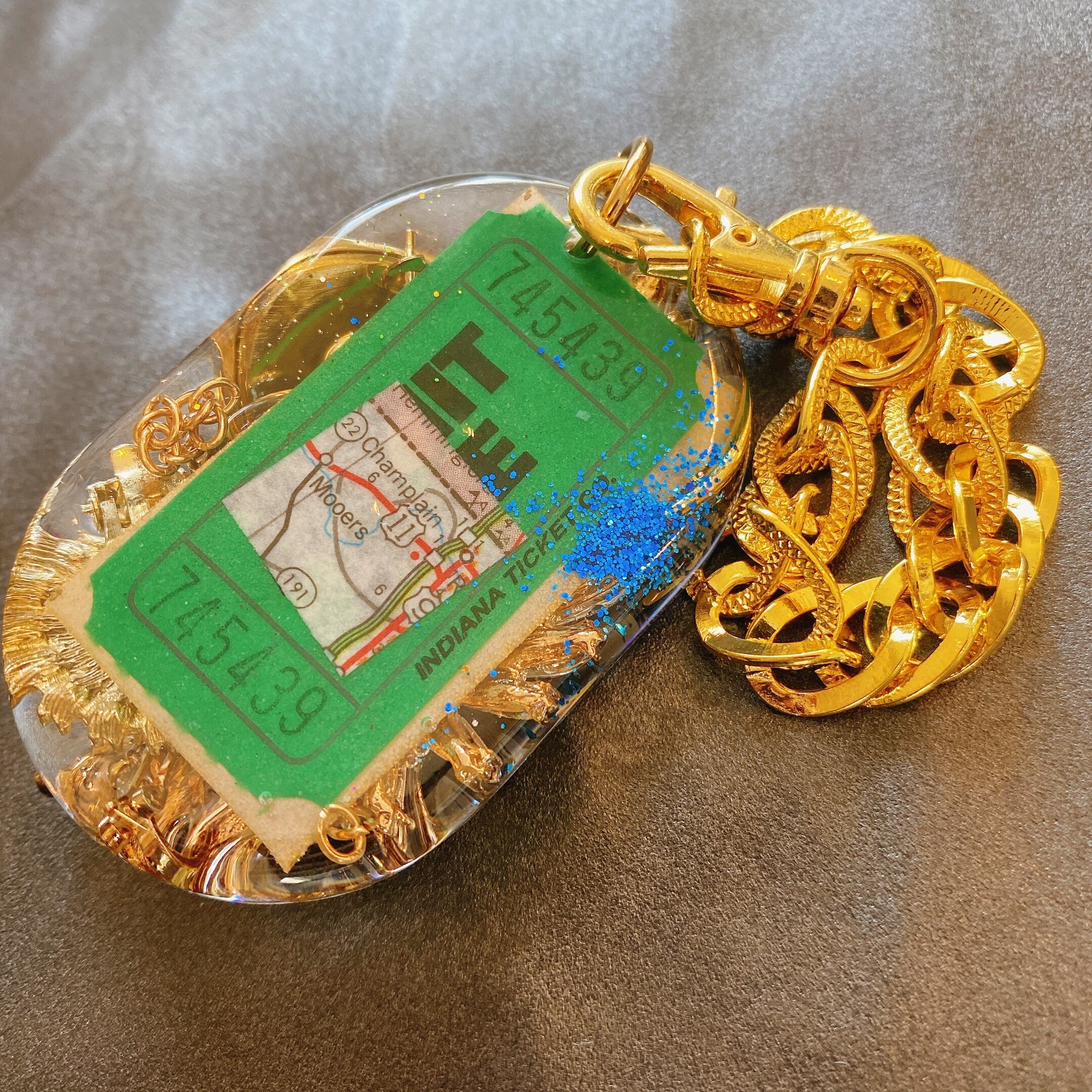 様々なジュエルパーツ、アクリルボールやシードビーズ、ユニークなモチーフたち、デザインによっては鍵(レプリカではない、実際にアメリカで活躍していた鍵です)をコラージュしながら重ね固めております。