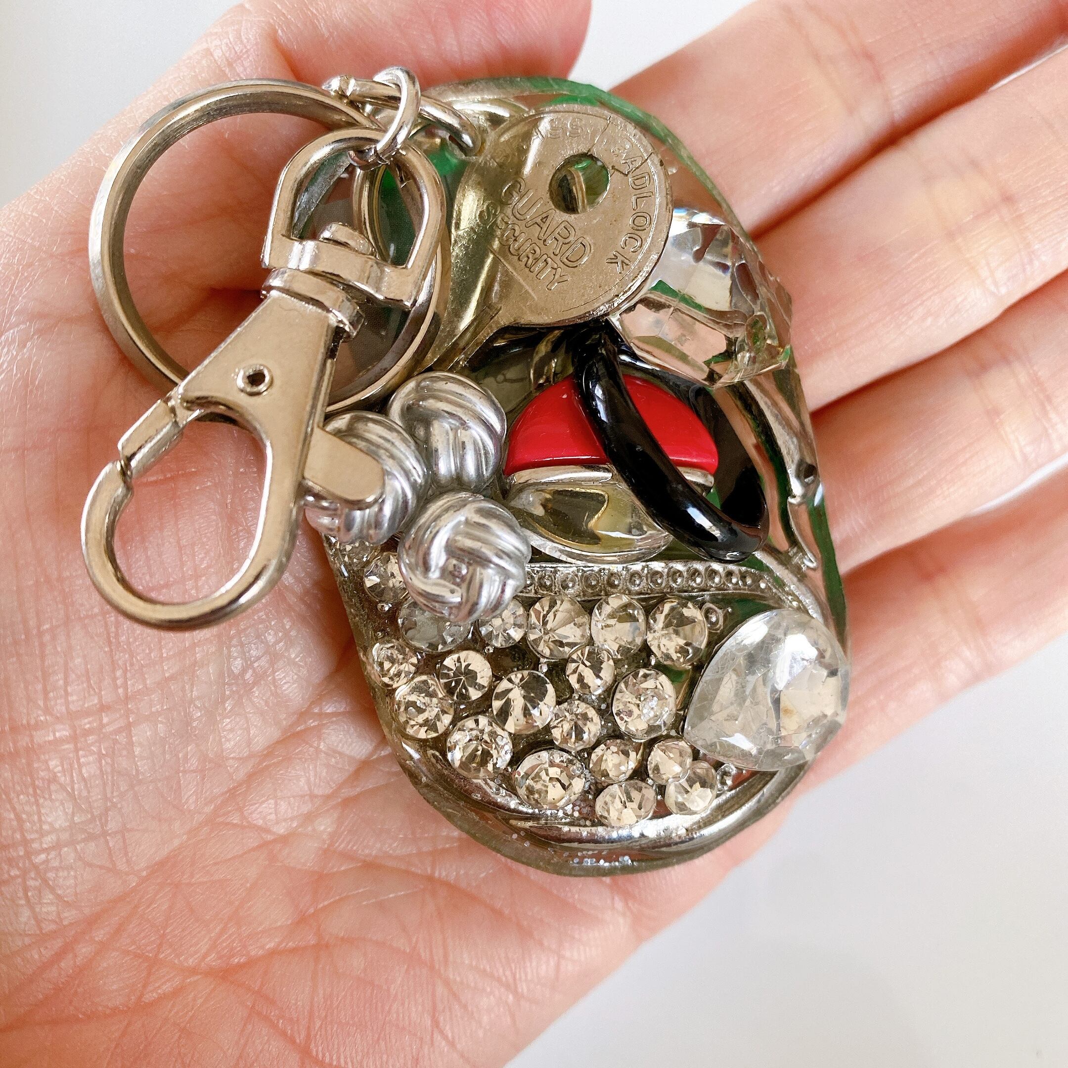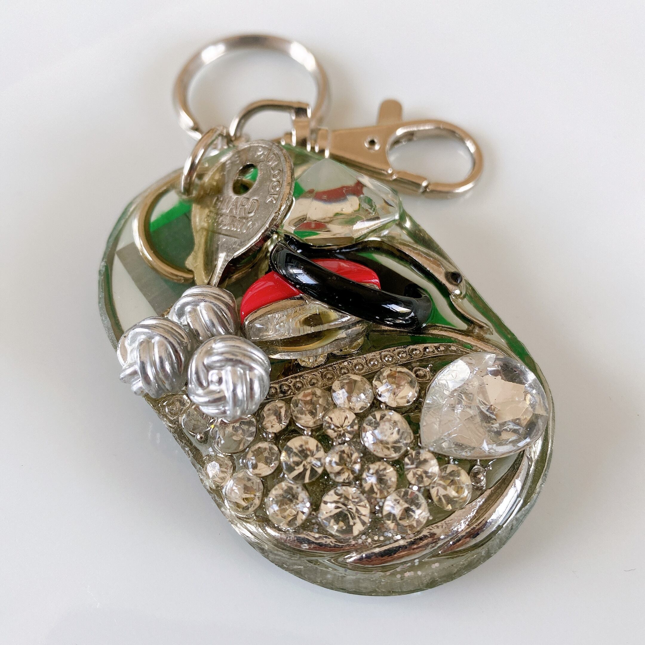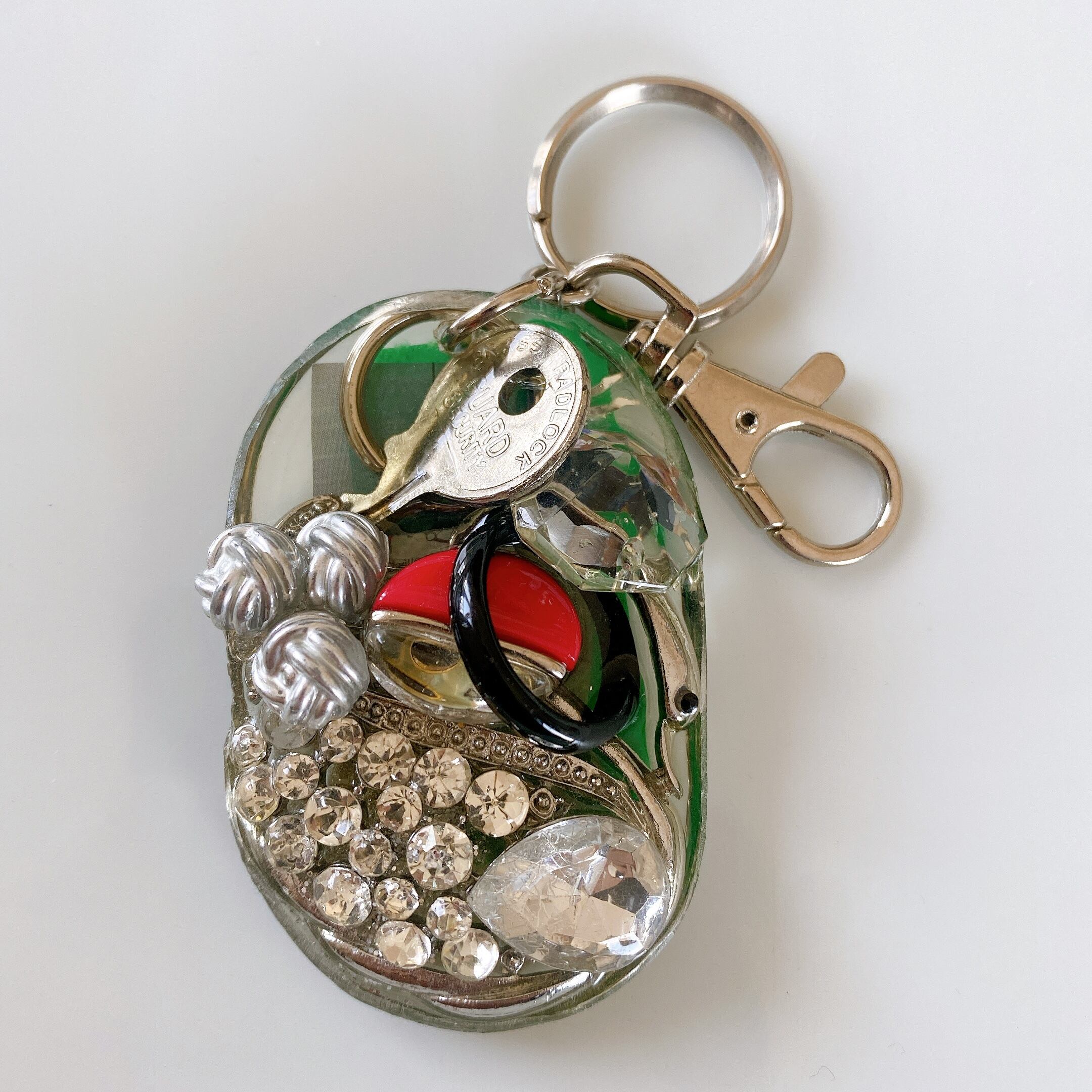 様々なジュエルパーツ、アクリルボールやシードビーズ、ユニークなモチーフたち、デザインによっては鍵(レプリカではない、実際にアメリカで活躍していた鍵です)をコラージュしながら重ね固めております。