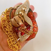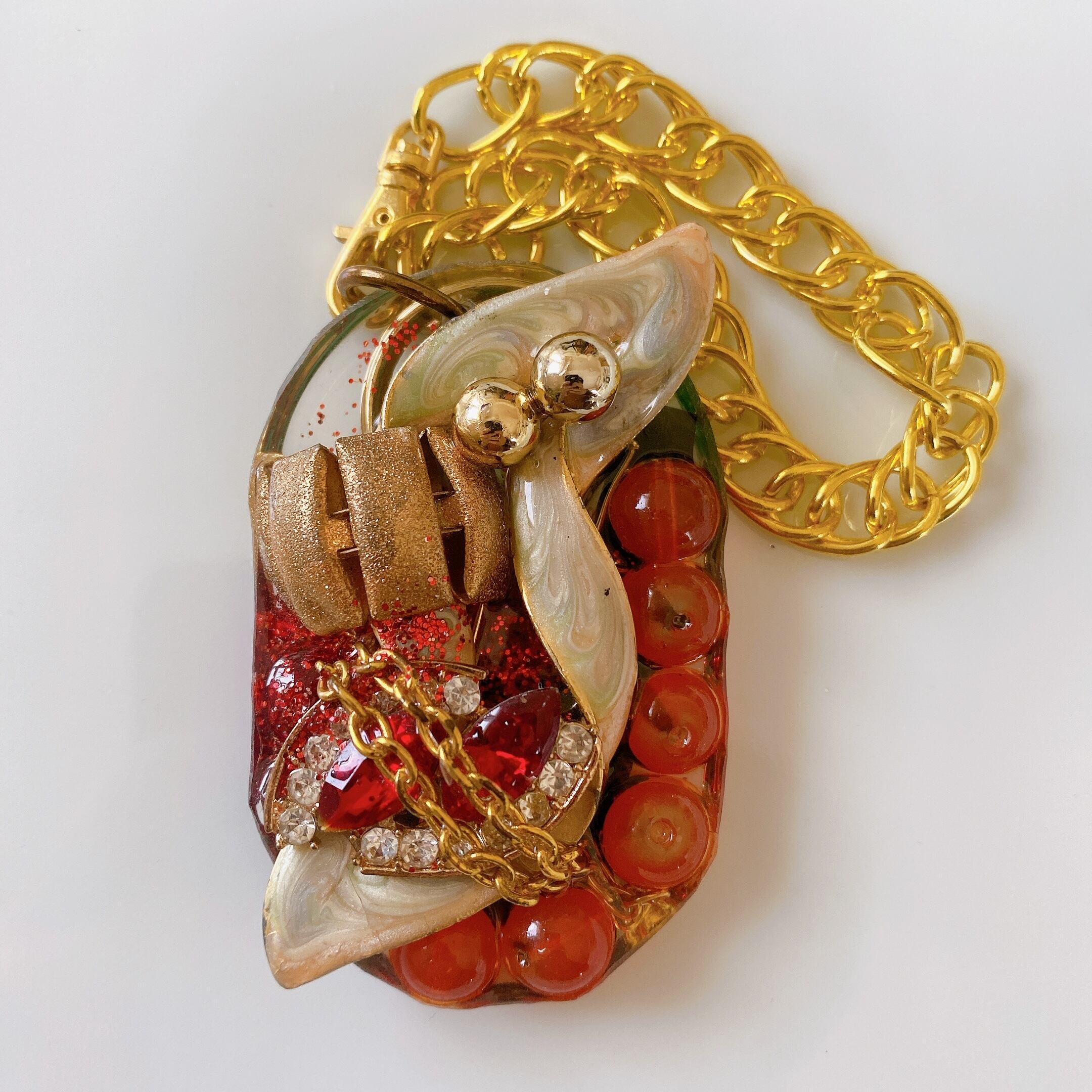 マーブル状に揺れるカラーのヴィンテージブローチをベースに、真紅のカッティングピアス、ボールピアス、多種チェーンを渡してキラキラのラメを散りばめました。
