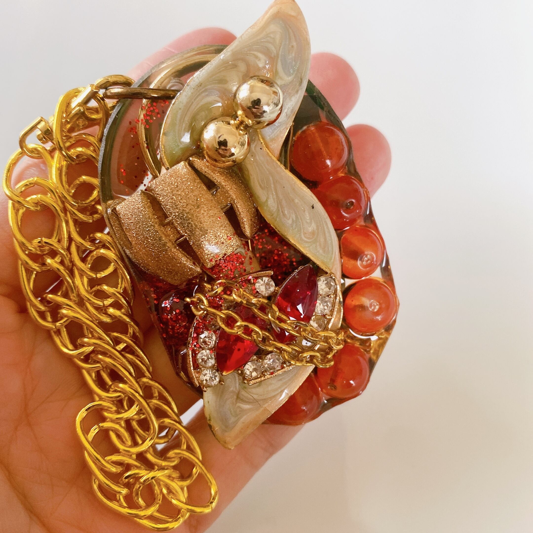 様々なジュエルパーツ、アクリルボールやシードビーズ、ユニークなモチーフたち、デザインによっては鍵(レプリカではない、実際にアメリカで活躍していた鍵です)をコラージュしながら重ね固めております。