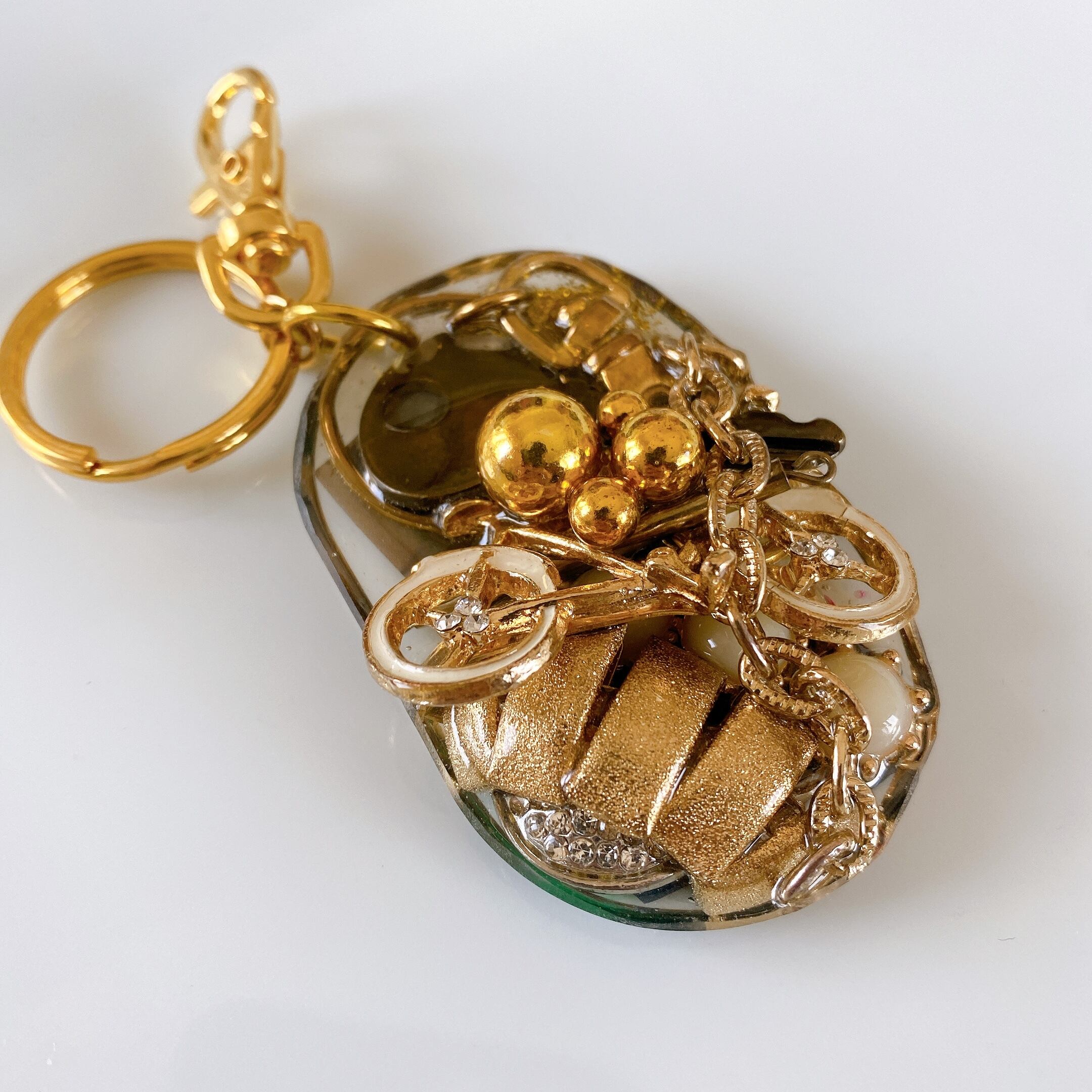 様々なジュエルパーツ、アクリルボールやシードビーズ、ユニークなモチーフたち、デザインによっては鍵(レプリカではない、実際にアメリカで活躍していた鍵です)をコラージュしながら重ね固めております。