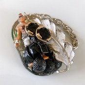 様々なジュエルパーツ、アクリルボールやシードビーズ、ユニークなモチーフたち、デザインによっては鍵(レプリカではない、実際にアメリカで活躍していた鍵です)をコラージュしながら重ね固めております。