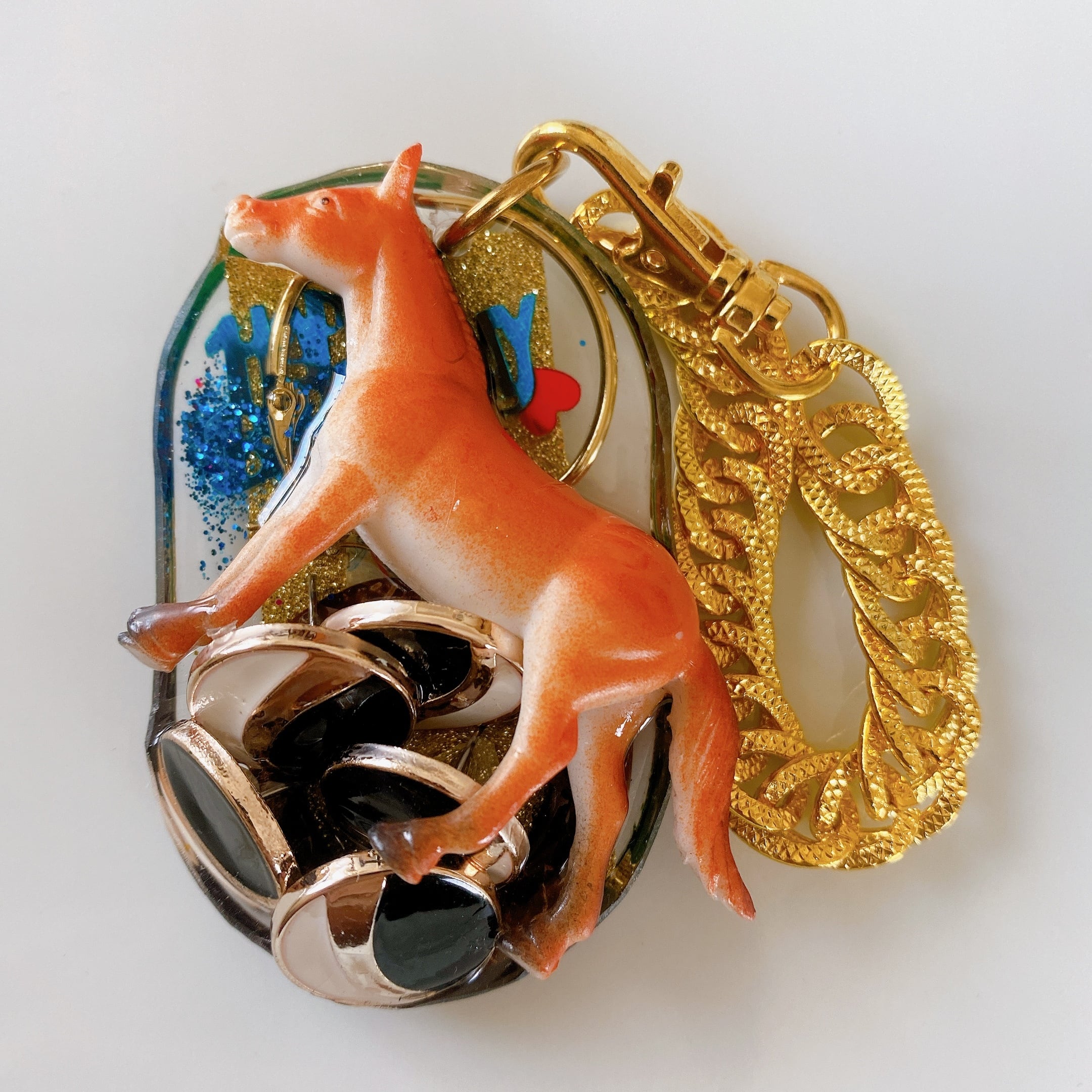 様々なジュエルパーツ、アクリルボールやシードビーズ、ユニークなモチーフたち、デザインによっては鍵(レプリカではない、実際にアメリカで活躍していた鍵です)をコラージュしながら重ね固めております。