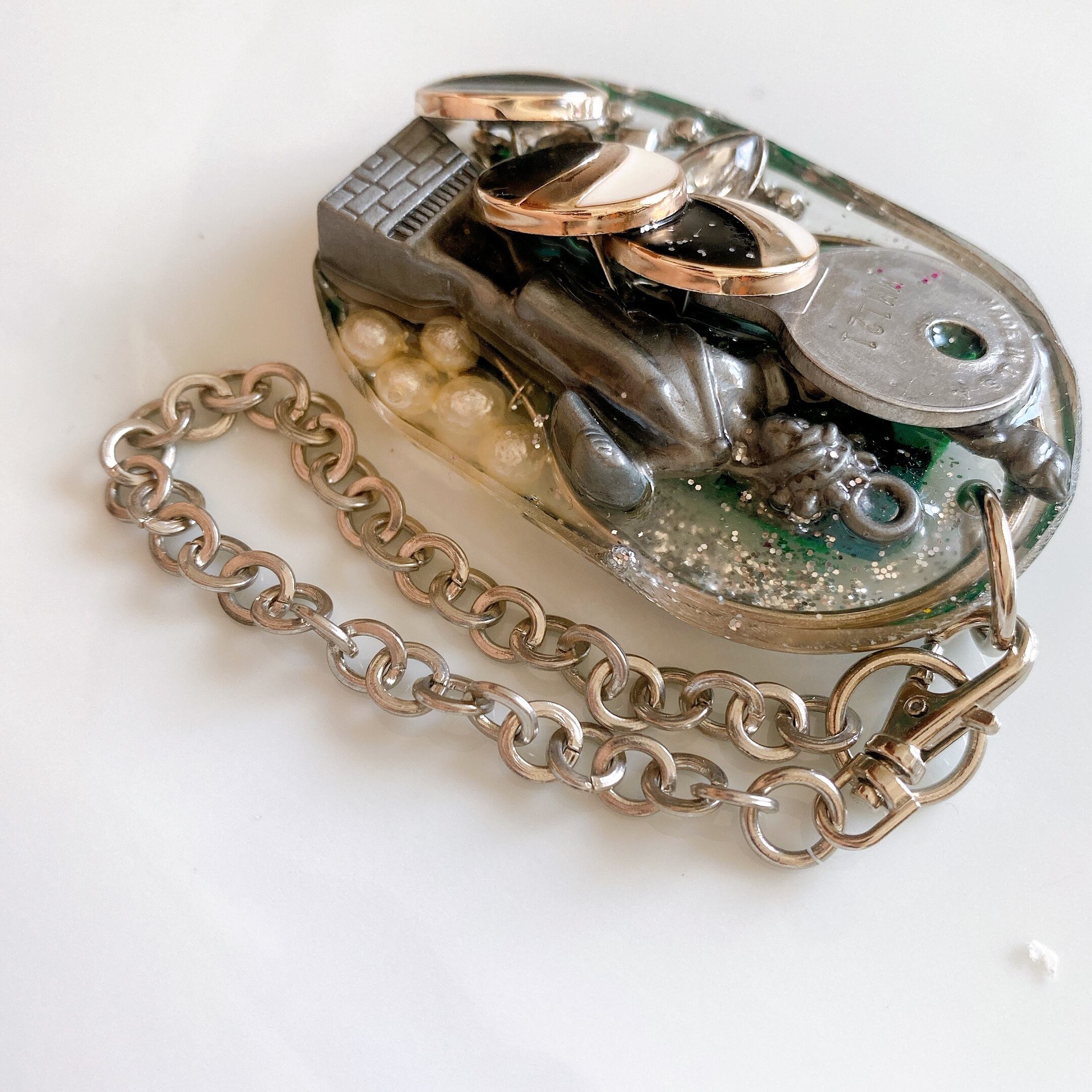 様々なジュエルパーツ、アクリルボールやシードビーズ、ユニークなモチーフたち、デザインによっては鍵(レプリカではない、実際にアメリカで活躍していた鍵です)をコラージュしながら重ね固めております。