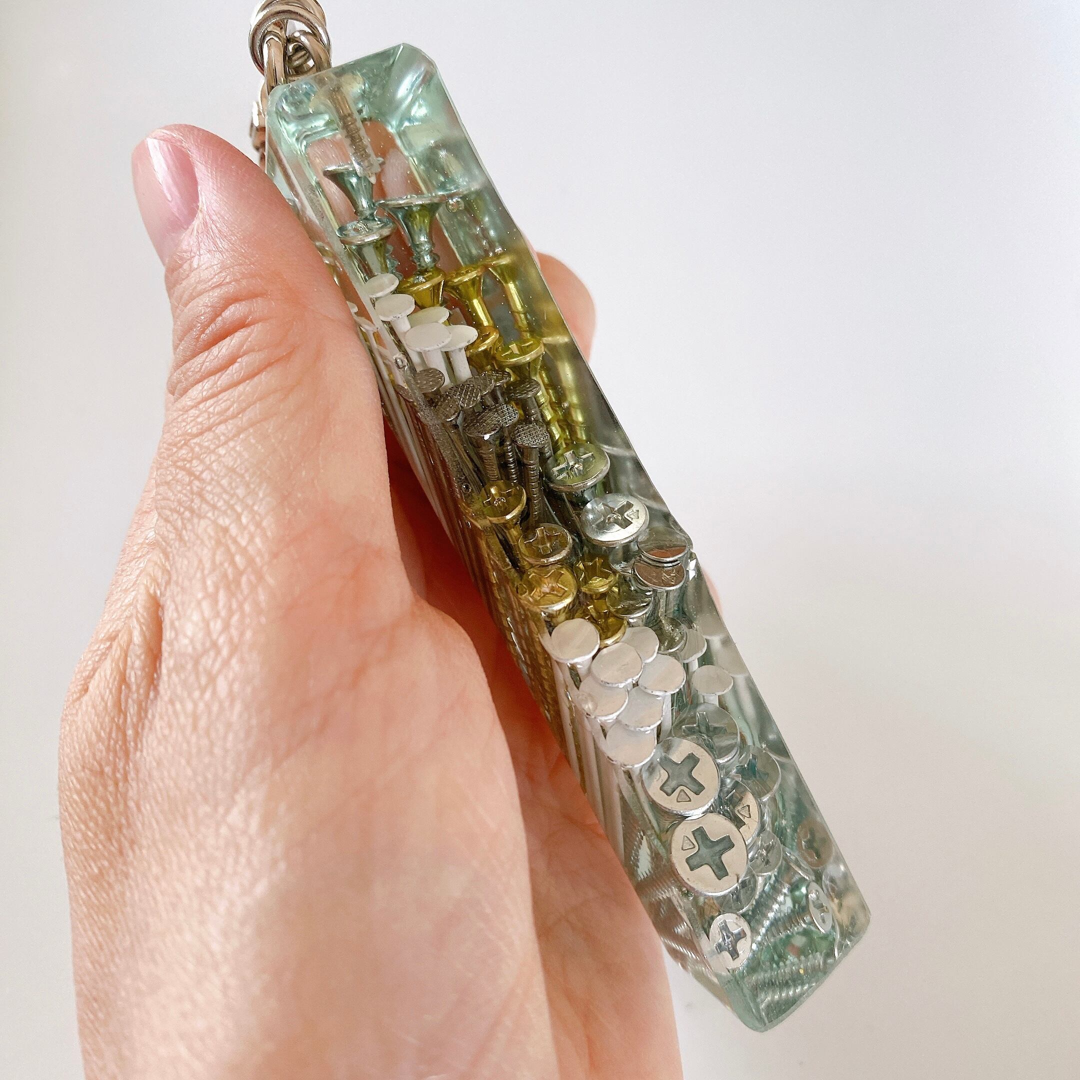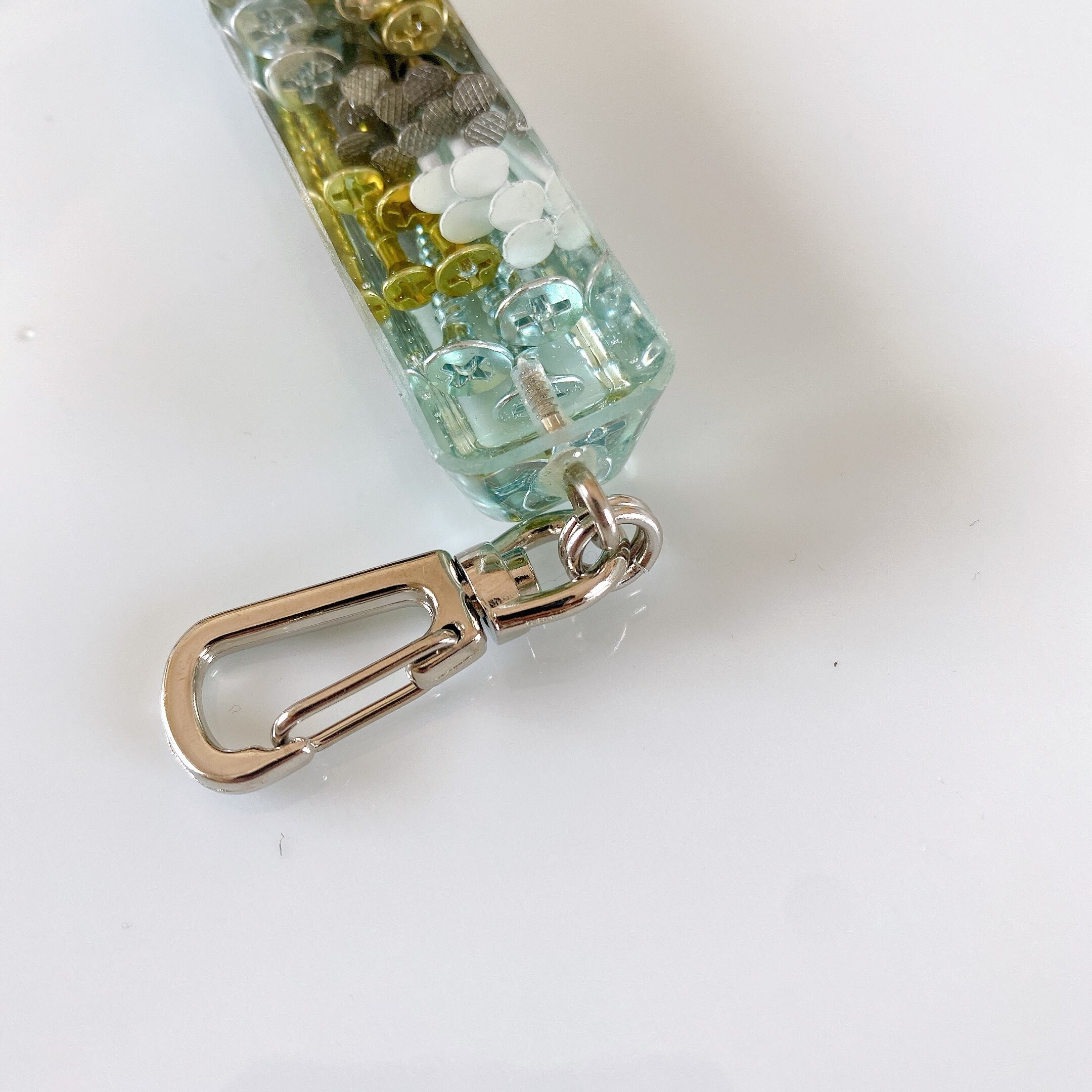 樹脂自体にもクリアから薄いブルーのグラデーションを施しました。横から見ると色の層が特に分かりやすいです。