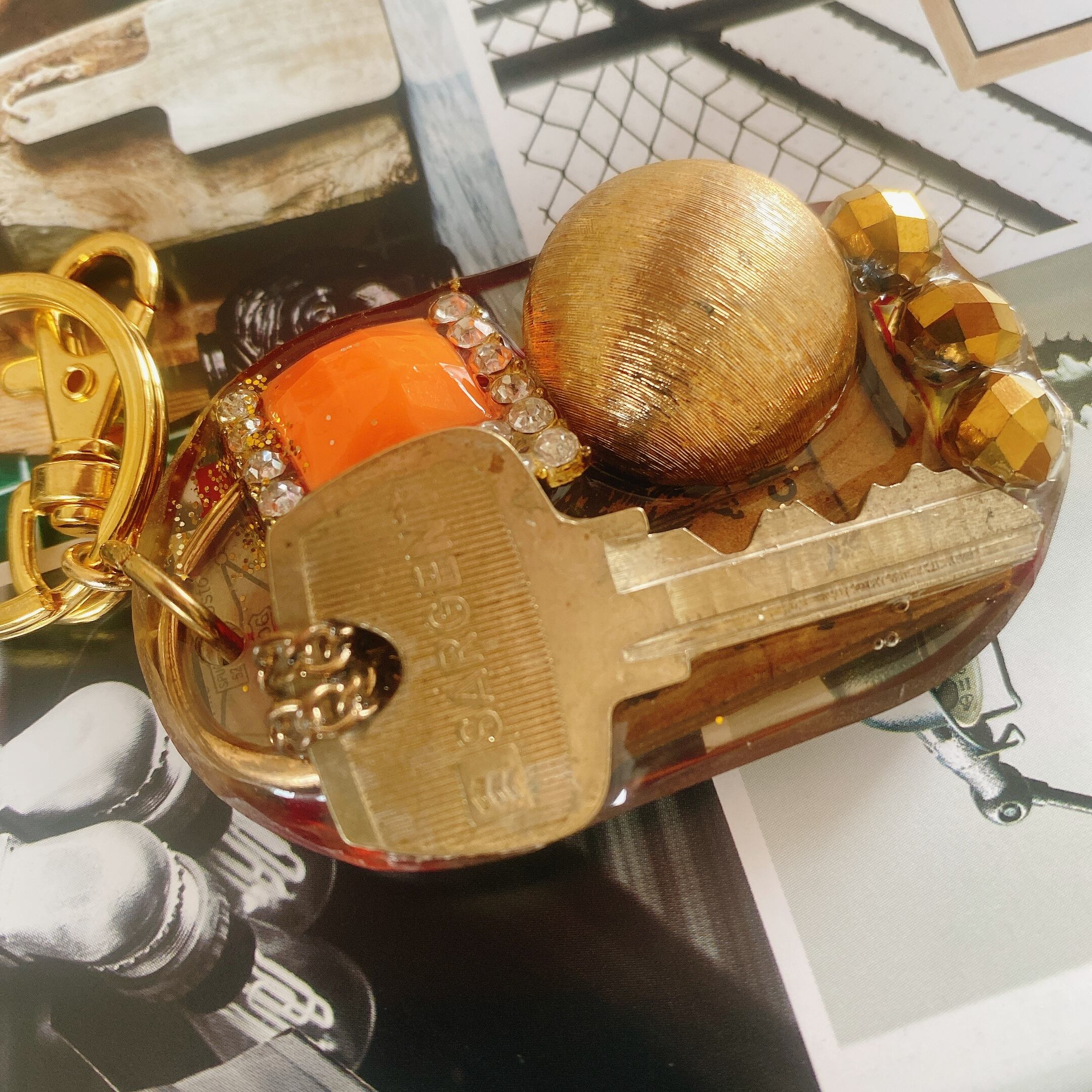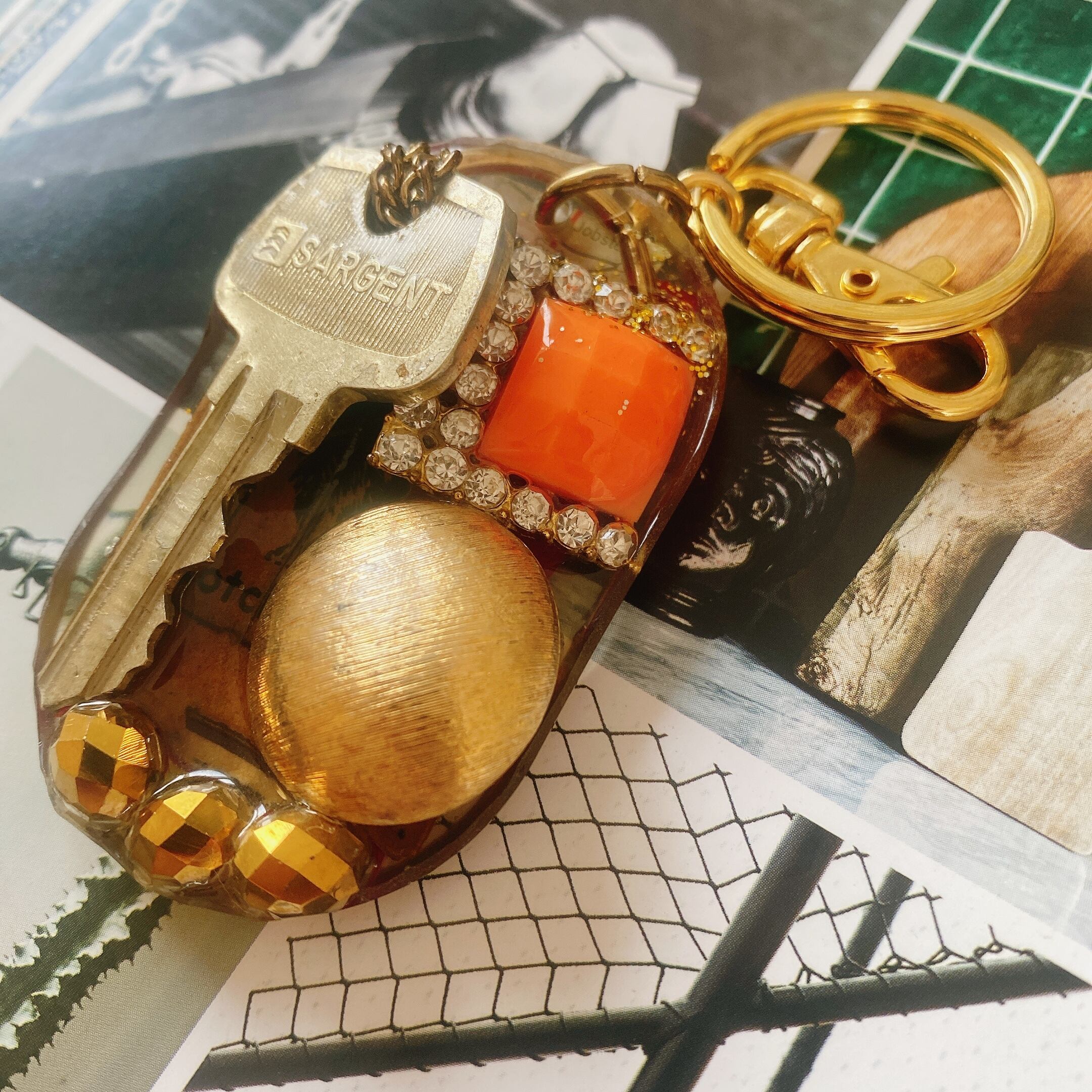 様々なジュエルパーツ、アクリルボールやシードビーズ、ユニークなモチーフたち、デザインによっては鍵(レプリカではない、実際にアメリカで活躍していた鍵です)をコラージュしながら重ね固めております。