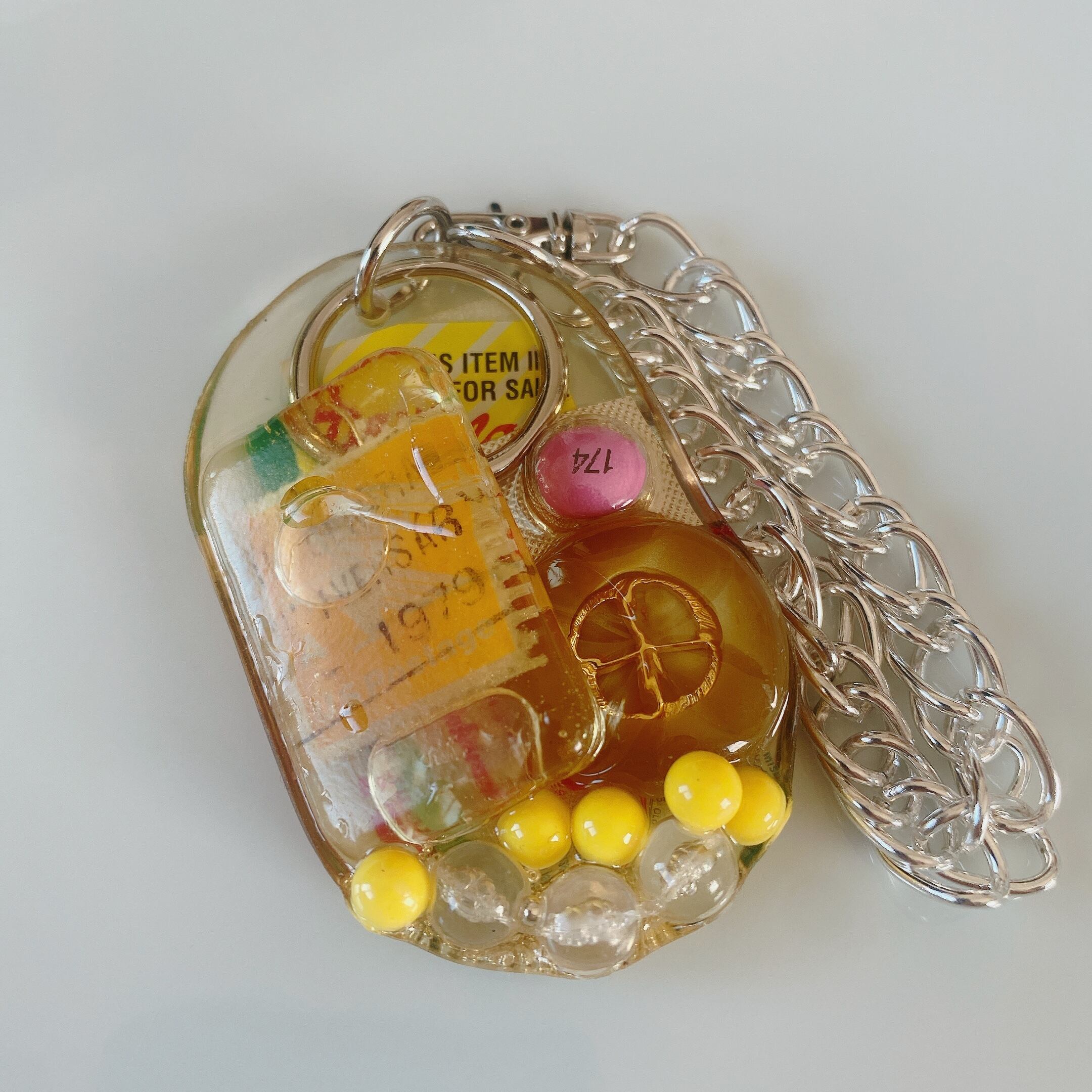 様々なジュエルパーツ、アクリルボールやシードビーズ、ユニークなモチーフたち、デザインによっては鍵(レプリカではない、実際にアメリカで活躍していた鍵です)をコラージュしながら重ね固めております。