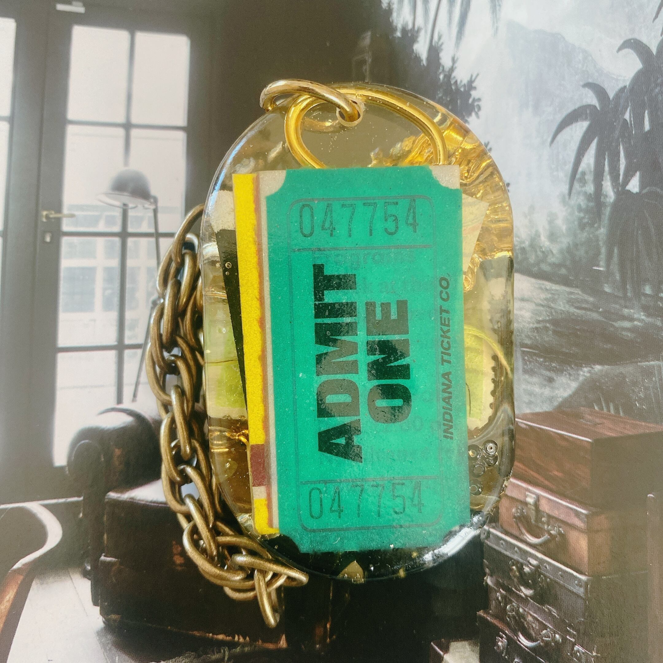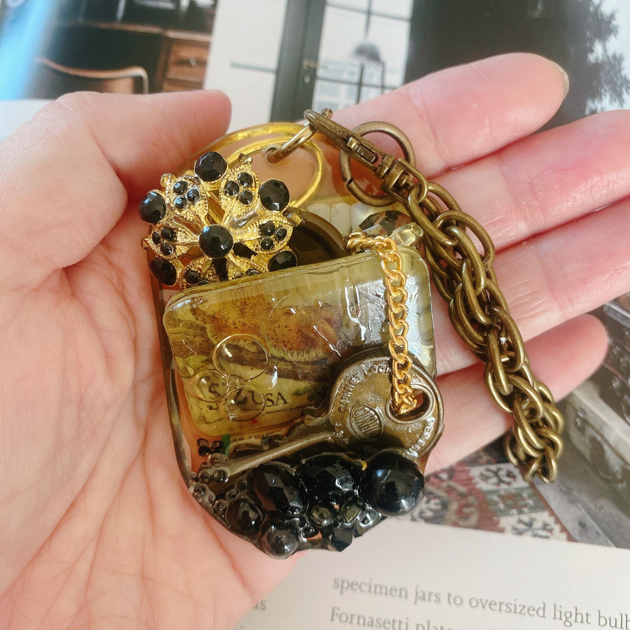 アメリカの鍵から伸びるチェーンで包んだのは、古切手が入った樹脂のオブジェ。下からヴィンテージボタンやイヤリングパーツを挟み押し上げることで、立体感を最大限に楽しめます。