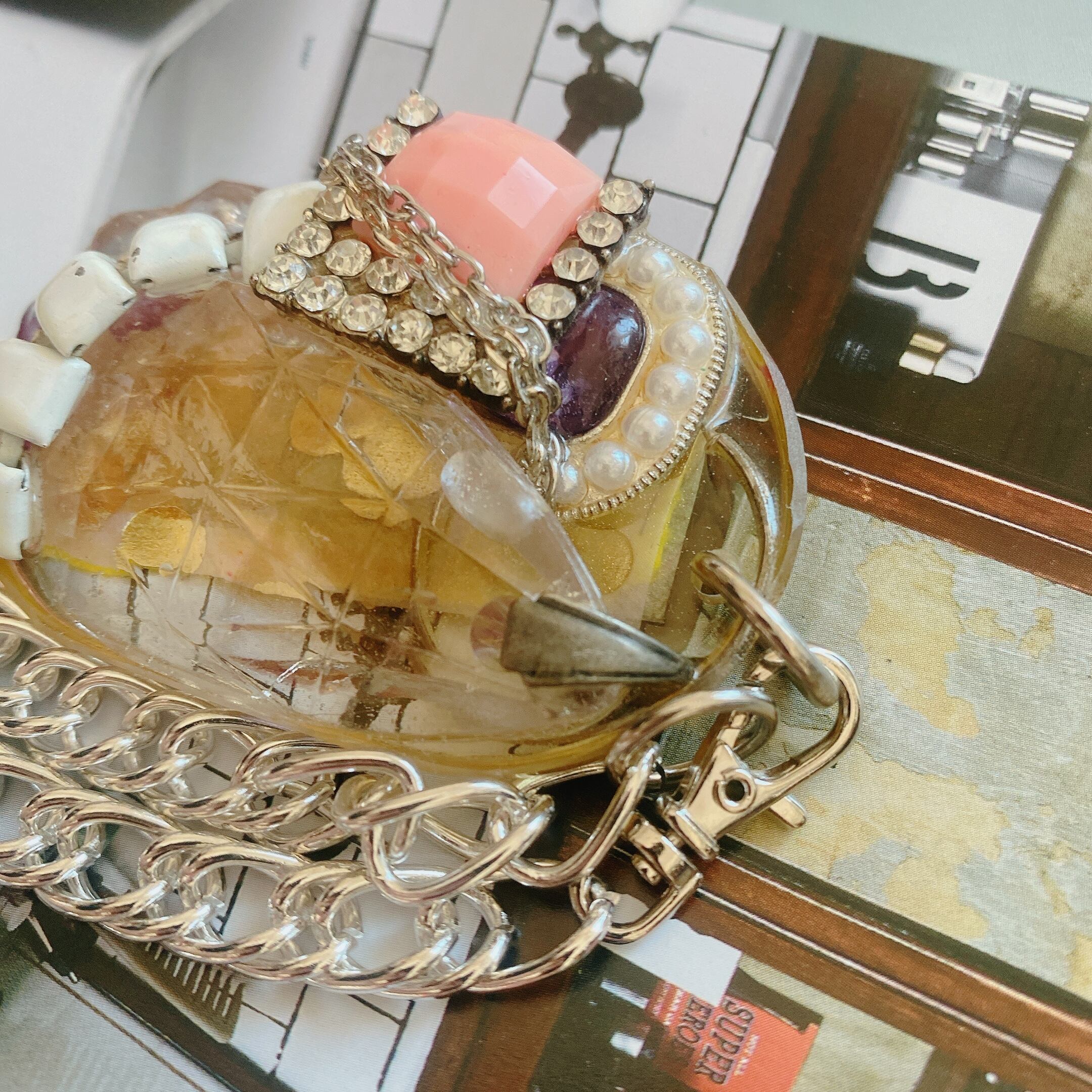 様々なジュエルパーツ、アクリルボールやシードビーズ、ユニークなモチーフたち、デザインによっては鍵(レプリカではない、実際にアメリカで活躍していた鍵です)をコラージュしながら重ね固めております。