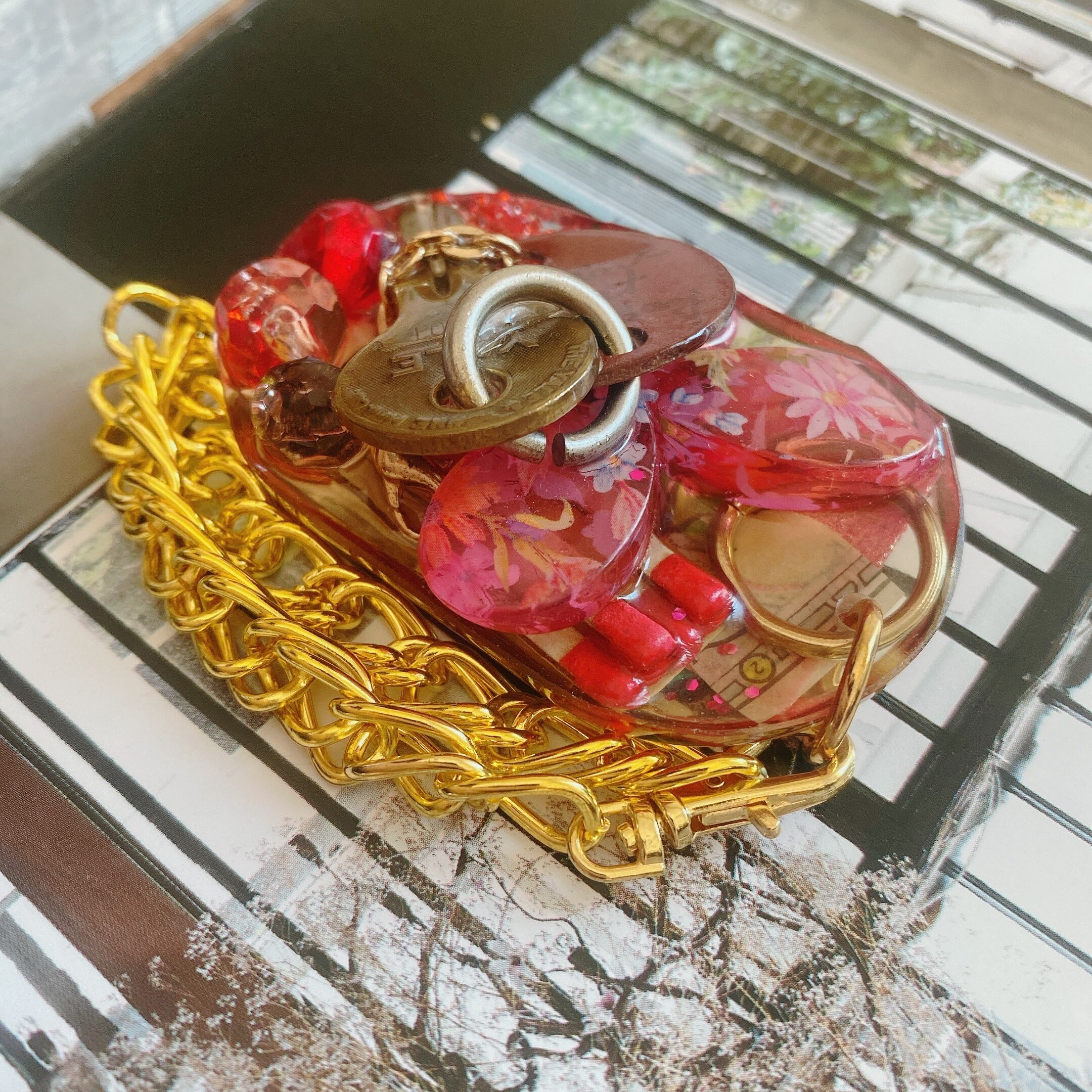 様々なジュエルパーツ、アクリルボールやシードビーズ、ユニークなモチーフたち、デザインによっては鍵(レプリカではない、実際にアメリカで活躍していた鍵です)をコラージュしながら重ね固めております。