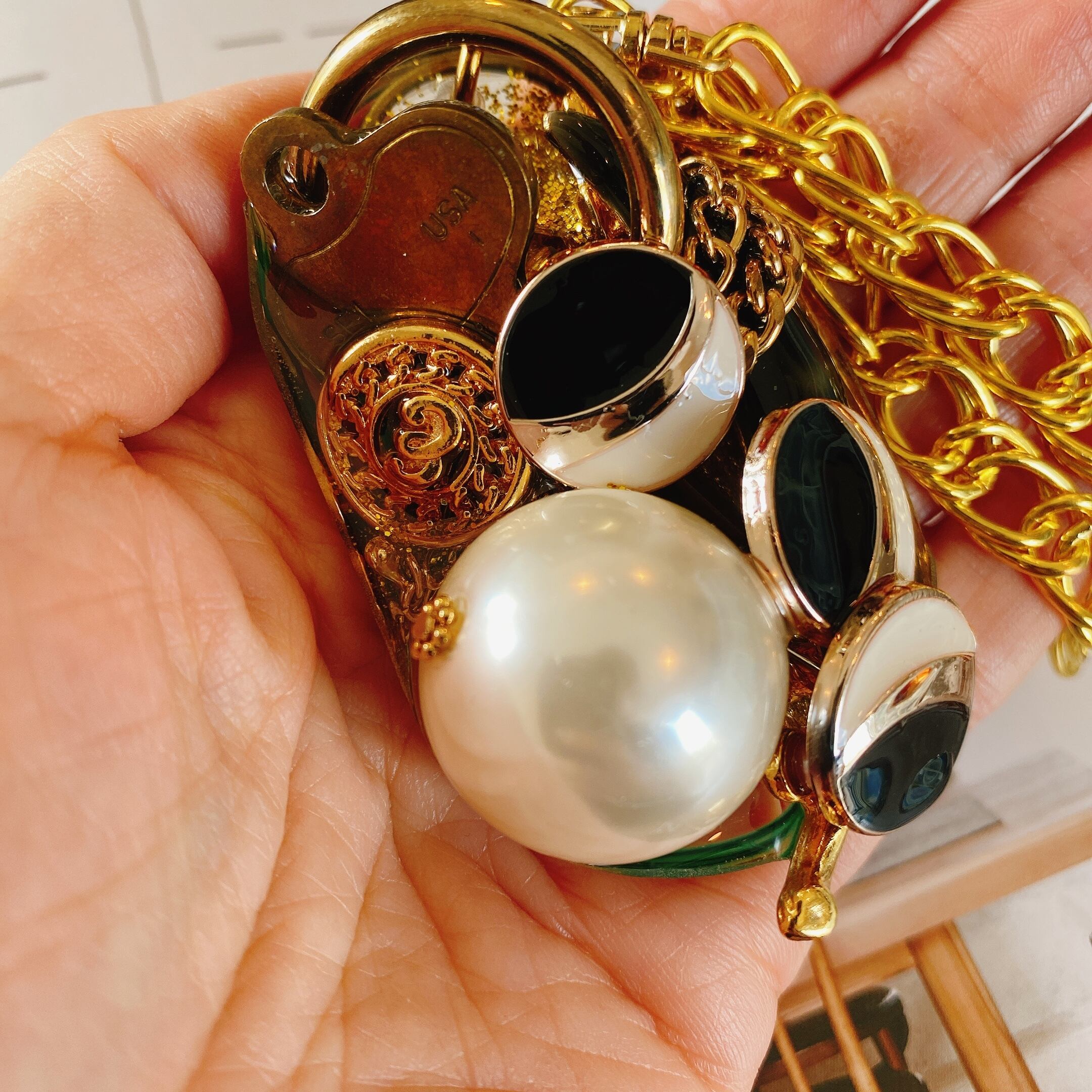 パッと目を引く大きな白玉は、ペンダントトップとして使われていたもの。金具込みで固めているため、パールパーツは外れにくくしっかりと固定されています。