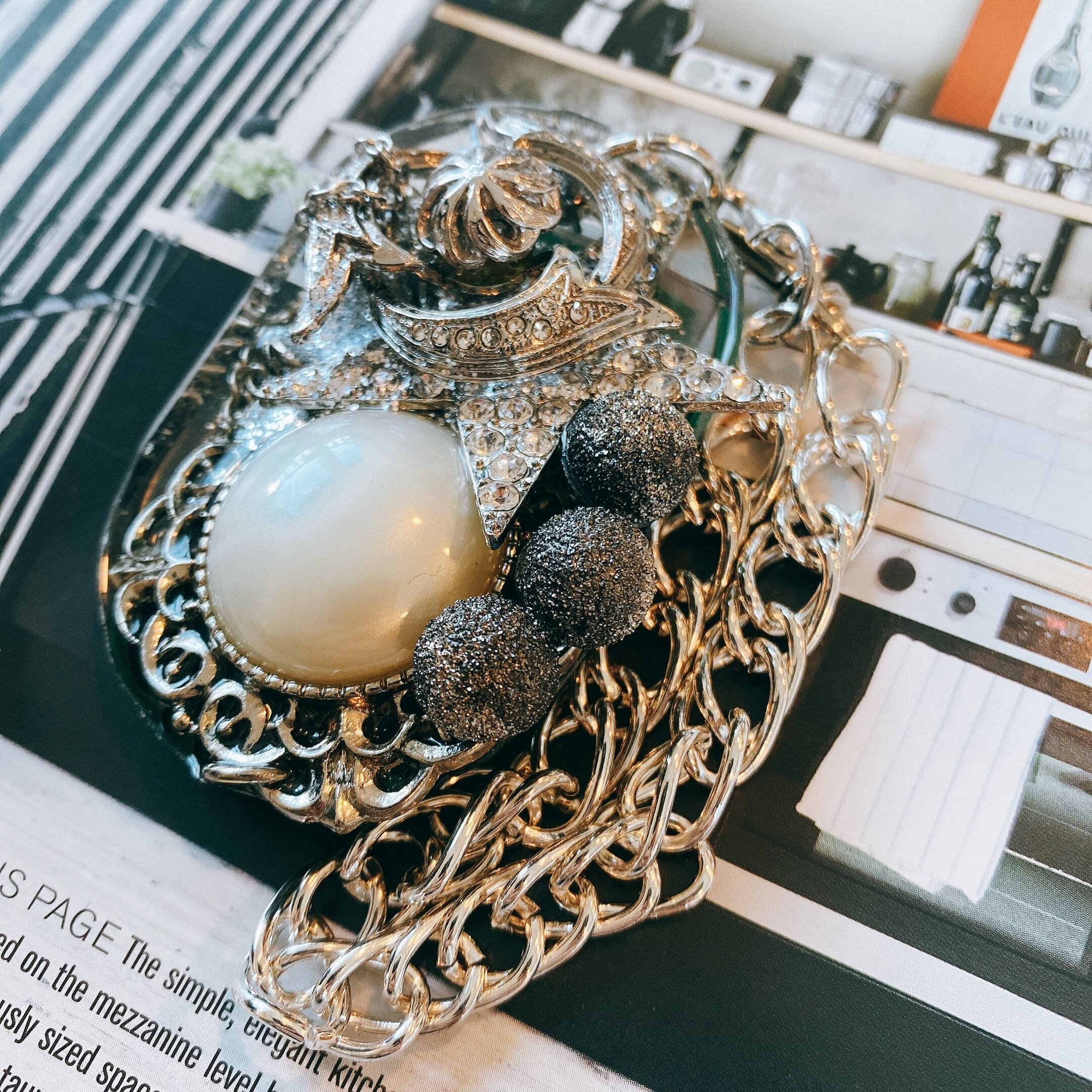 様々なジュエルパーツ、アクリルボールやシードビーズ、ユニークなモチーフたち、デザインによっては鍵(レプリカではない、実際にアメリカで活躍していた鍵です)をコラージュしながら重ね固めております。