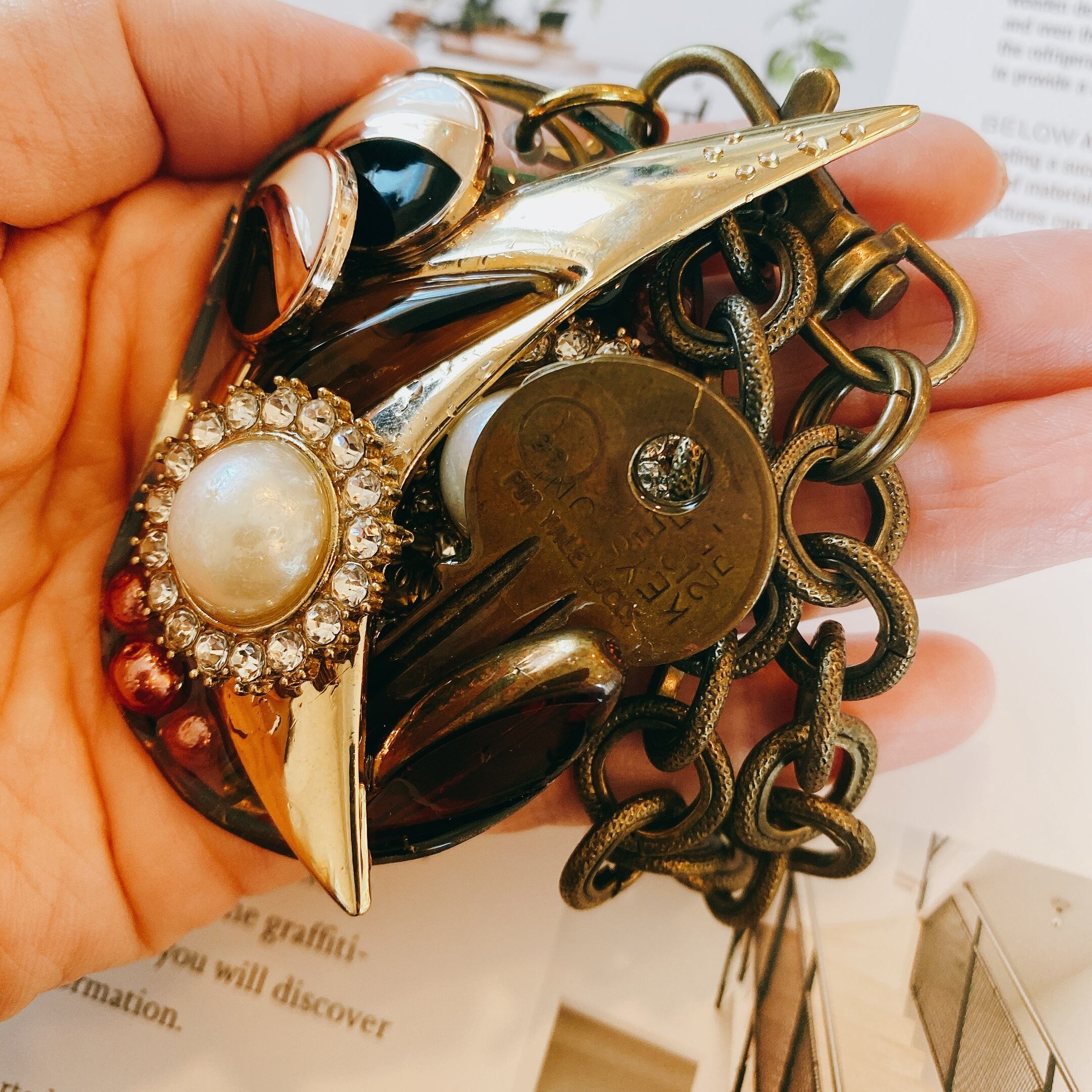 様々なジュエルパーツ、アクリルボールやシードビーズ、ユニークなモチーフたち、デザインによっては鍵(レプリカではない、実際にアメリカで活躍していた鍵です)をコラージュしながら重ね固めております。