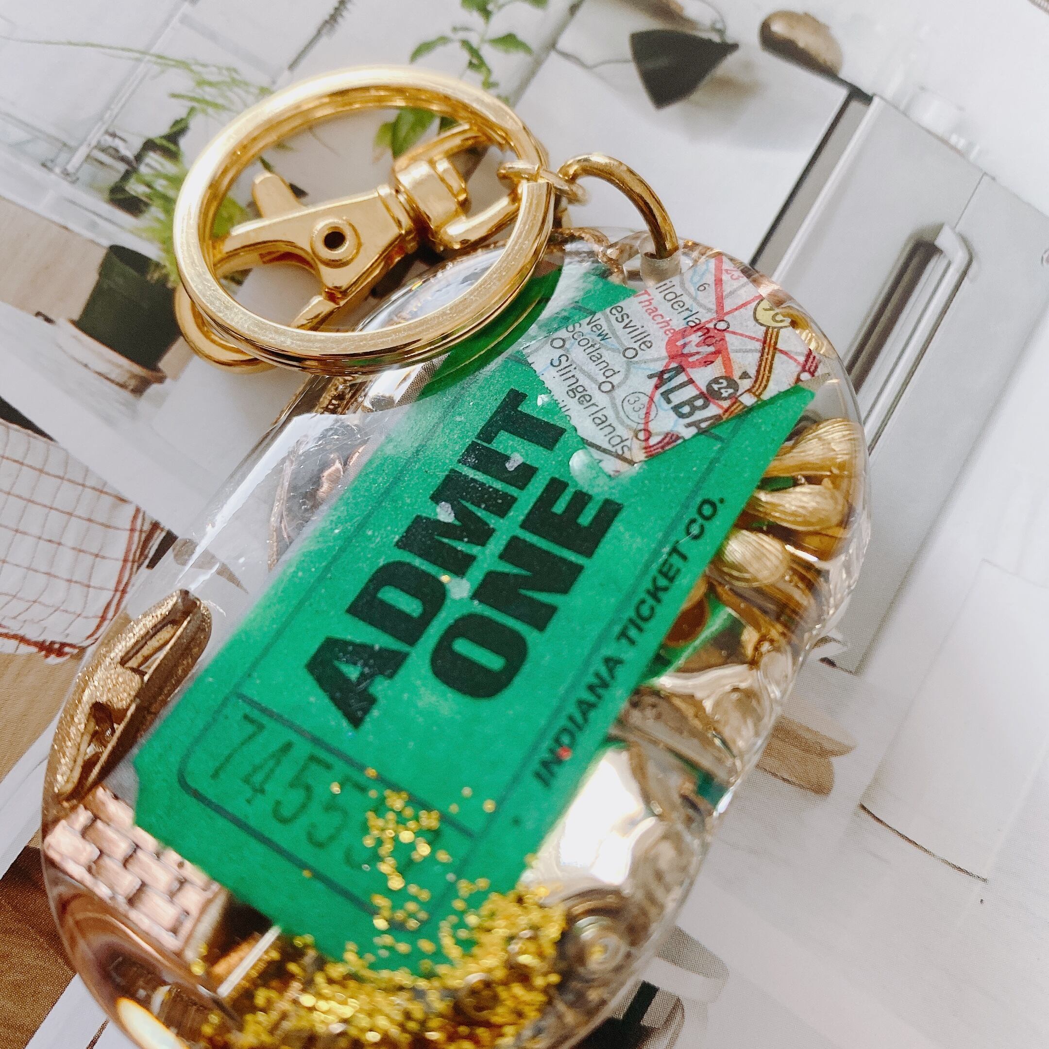 様々なジュエルパーツ、アクリルボールやシードビーズ、ユニークなモチーフたち、デザインによっては鍵(レプリカではない、実際にアメリカで活躍していた鍵です)をコラージュしながら重ね固めております。