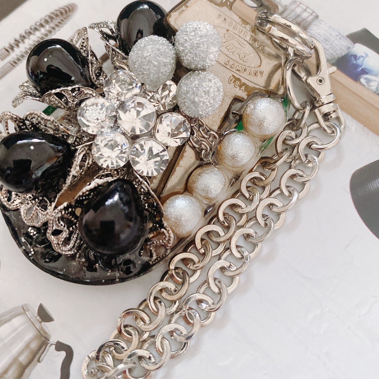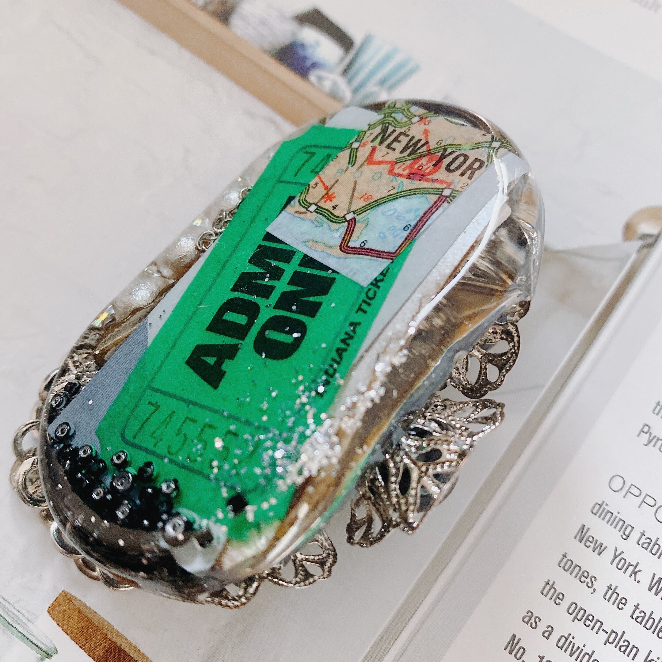 様々なジュエルパーツ、アクリルボールやシードビーズ、ユニークなモチーフたち、デザインによっては鍵(レプリカではない、実際にアメリカで活躍していた鍵です)をコラージュしながら重ね固めております。