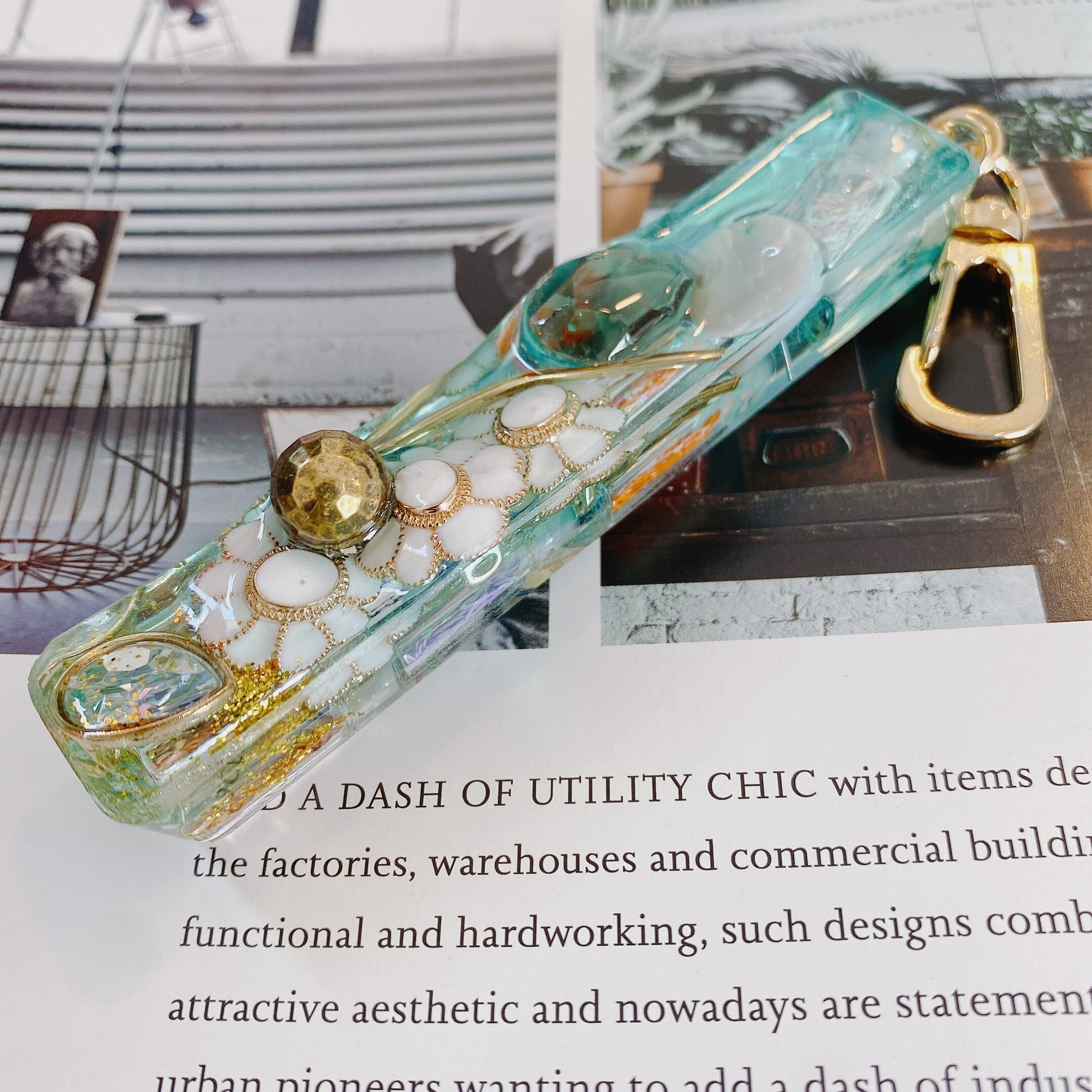 上からは様々なジュエルパーツを重ねて華やかに。樹脂自体にも淡く水色の着色をしています。